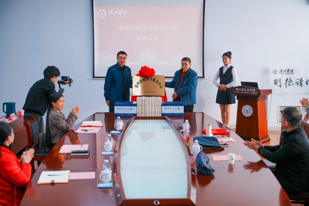 最后,图书馆负责人与刘建义共同为“德州捐赠图书服务中心”揭牌。红绸落下,标志着“德州捐赠图书服务中心”正式成立。