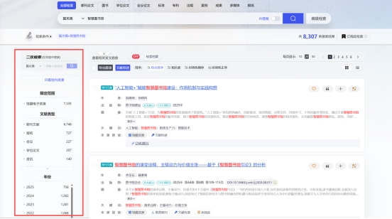 分面聚类:检索结果页可通过“文献类型”“学科”“语言”等维度进一步缩小范围,提升查准率。